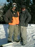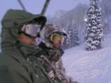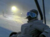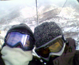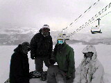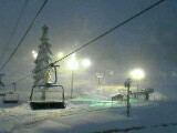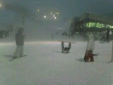 ライトアップされたゲレンデと、吹雪いてもミラーレンズのとよしー(左)とパウ脱出して雪まみれな縦兄(奥)と借りたゴーグル視界良好でご機嫌なアタシ